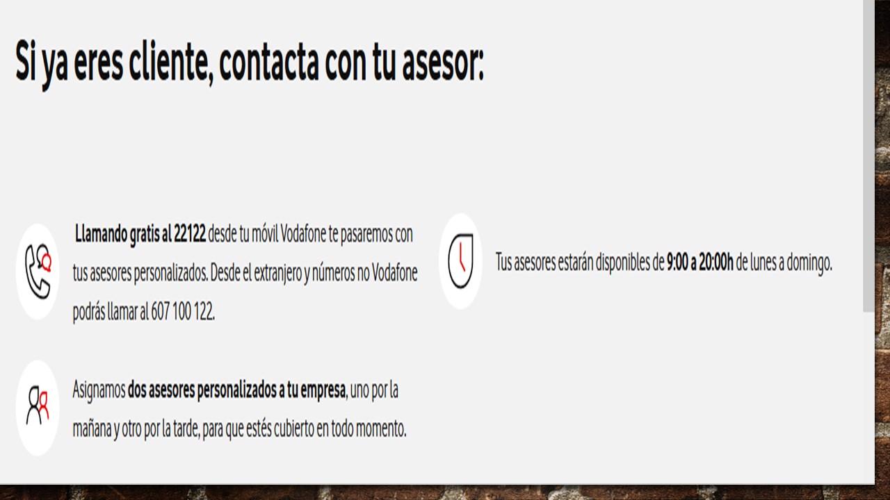 En Vodafone, queremos cuidar de ti y de tu empresa. Por eso, únicamente al contratar uno de nuestros planes Red Infinity con centralita virtual puedes disfrutar de forma totalmente gratuita de nuestro servicio de atención personalizada para empresas en el que dos agentes cuidadosamente seleccionados para tu negocio te asesorarán y acompañarán en todo momento, solucionando todas las dudas que puedan. ¡Así de sencillo!